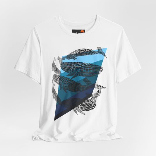 Sharing our love of nature and wildlife with this bold, abstract graphic print of humpack whales diving into the depths of the ocean. Shades from light to dark blue represent the pelagic zones. Model wearing our t is shown white.