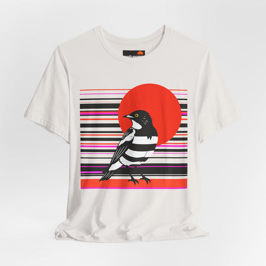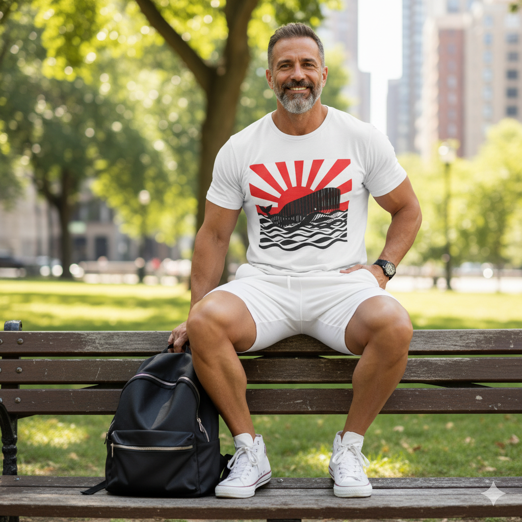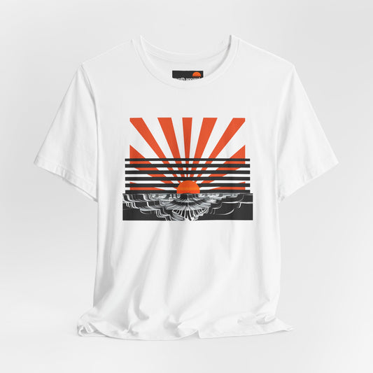 Moby graphic print with bold red sunset shown in white.