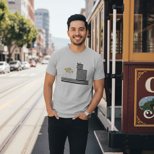 Sharing our love of nature and wildlife with this bold, abstract graphic print of humpack whales diving into the depths of the ocean. Shades from light to dark blue represent the pelagic zones. Model wearing our t is shown white.